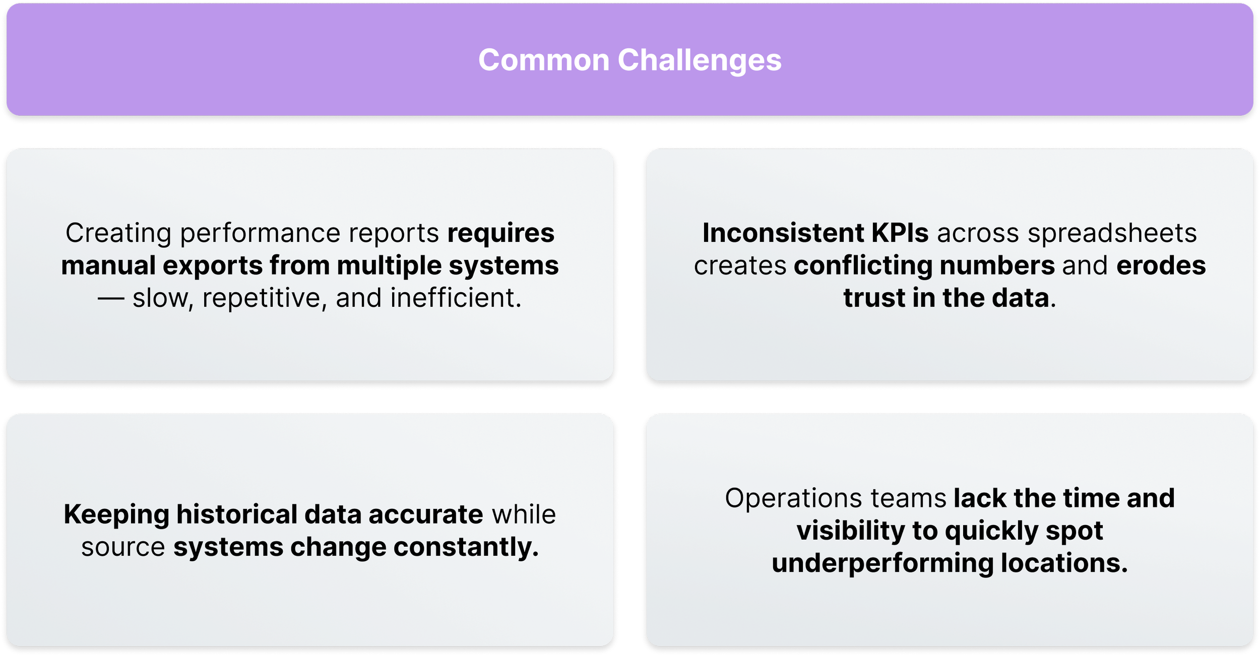 Single-location businesses focus on running one operation. Multi-location businesses must maintain consistency, visibility, and performance across many sites — often managing large, disconnected datasets that strain time and resources.